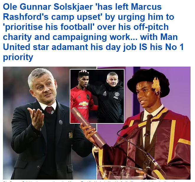 Dù có màn tái xuất như mơ song mới đây phía đội ngũ của Rashford vừa phát đi thông điệp rằng tiền đạo người Anh cảm thấy “buồn” và “tức giận” với phát biểu của Solskjaer, rằng ông muốn chân sút này tập trung vào bóng đá thay vì dành quá nhiều thời gian cho công việc từ thiện.
